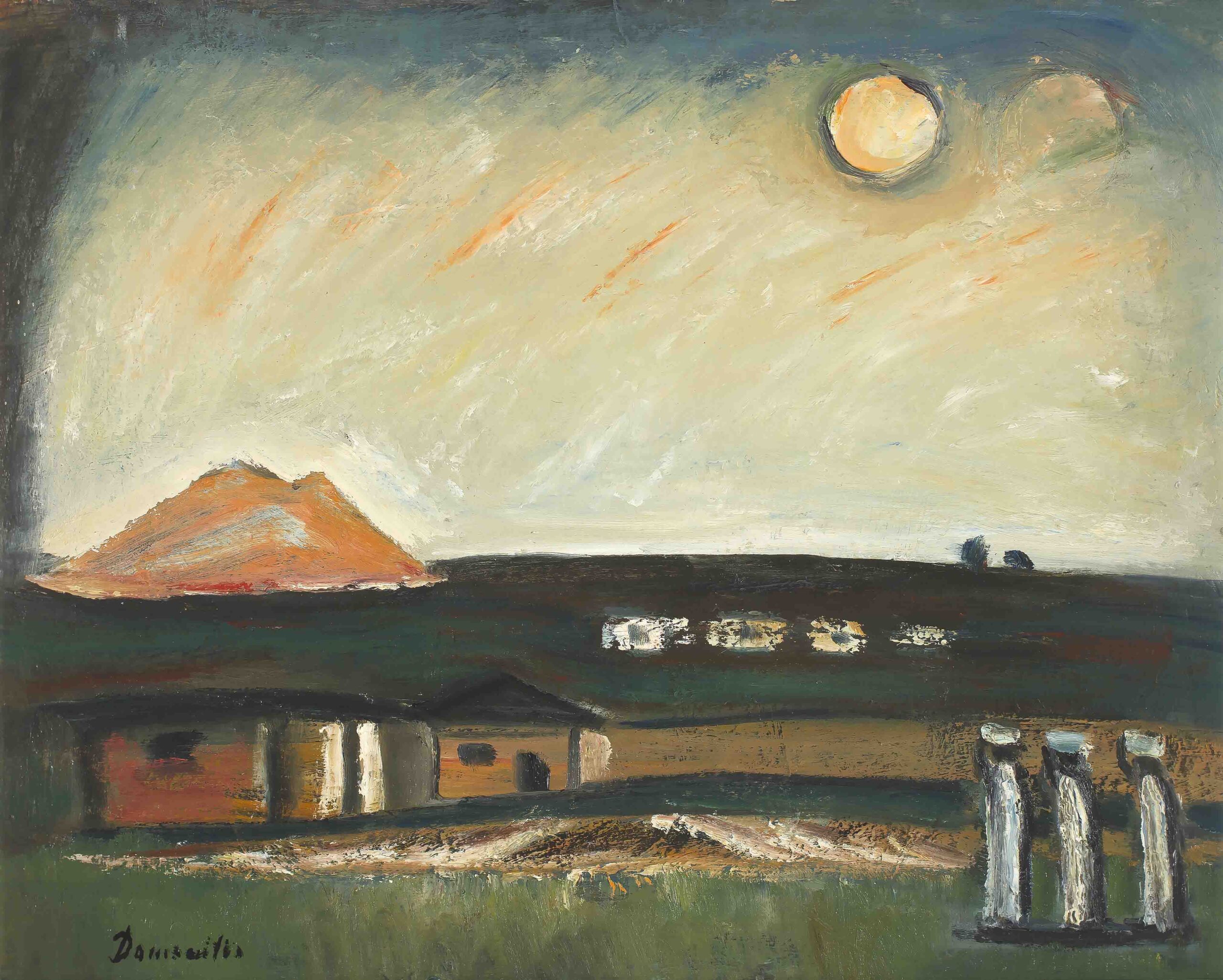 *Image of ‘Karoo landscape’, 1960. Oil on board by Pranas Domšaitis (1880 – 1965).
