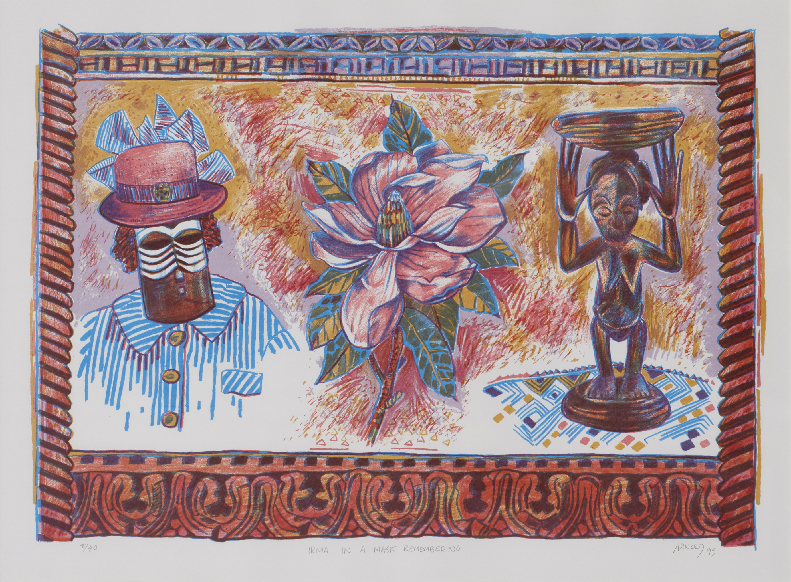 The collection of Arnold’s work, part of the Rupert Art Foundation and on show currently, originates from her exhibitions in Cape Town galleries and her close association with The Caversham Press. One of Arnold’s most influential texts is Irma Stern: A Feast for the Eye (1995). This was commissioned and published by the Rembrandt van Rijn Foundation as part of the centenary of Irma Stern’s birth; it remains a crucial source to scholars even 30 years after its publication. Included on show the silkscreen Irma in a Mask: Remembering produced by Arnold during the research and writing phase of this publication.