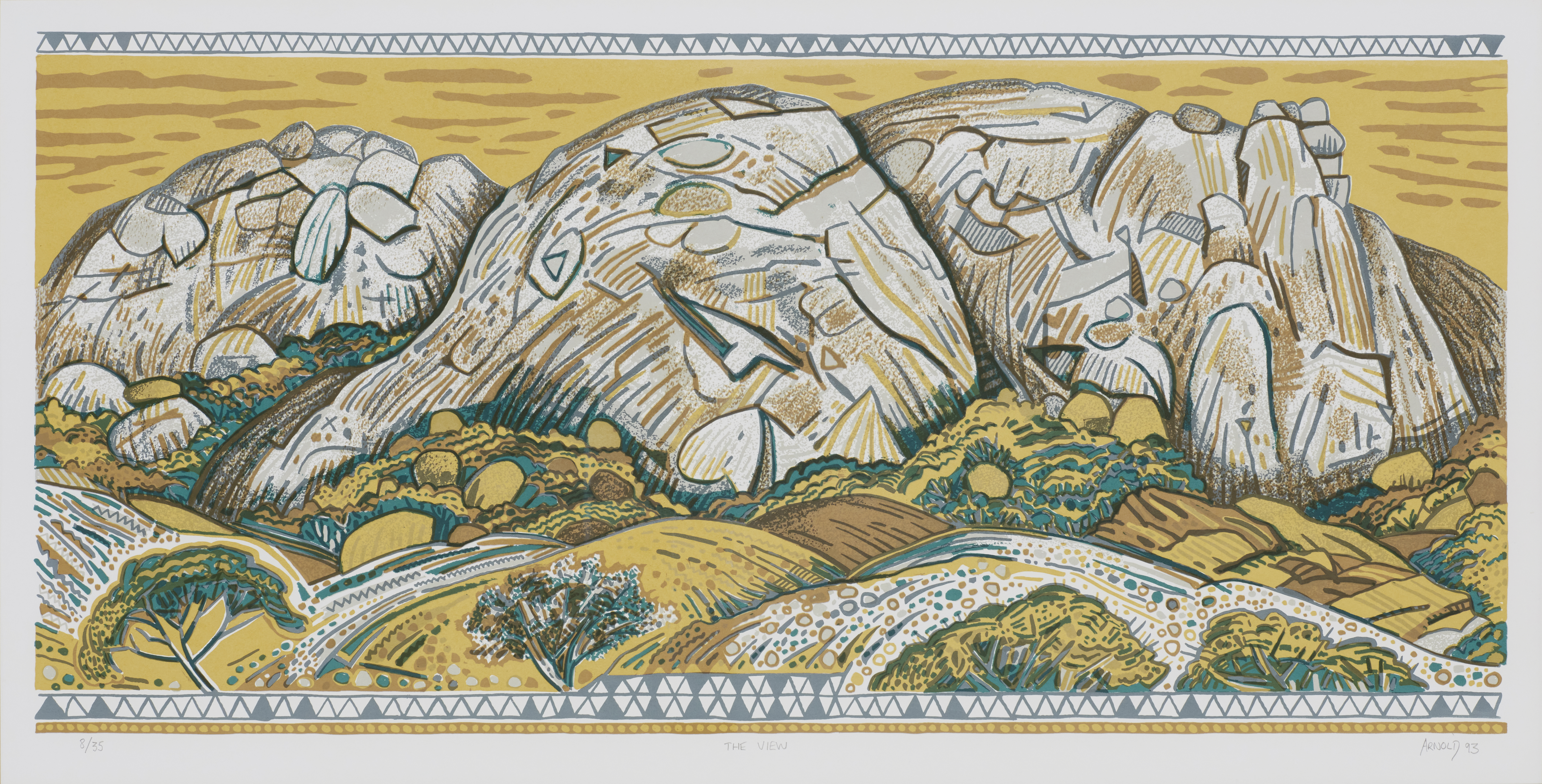 The Matopo Hills in Zimbabwe’s Matobo National Park, with their iconic balancing rocks, define much of her 1980s work. Botanical and floral elements explicitly signal her direct engagement with botanical art, feminism, and colonial research, studies, and commissions in South Africa.